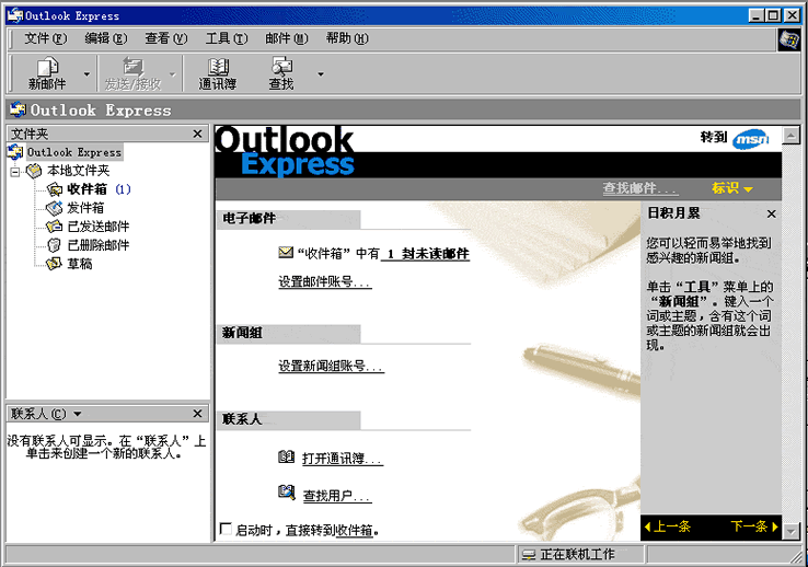 当前位置为Microsoft Outlook Express电子信箱配置说明的起始界面,要进行邮箱的配置,请点击(